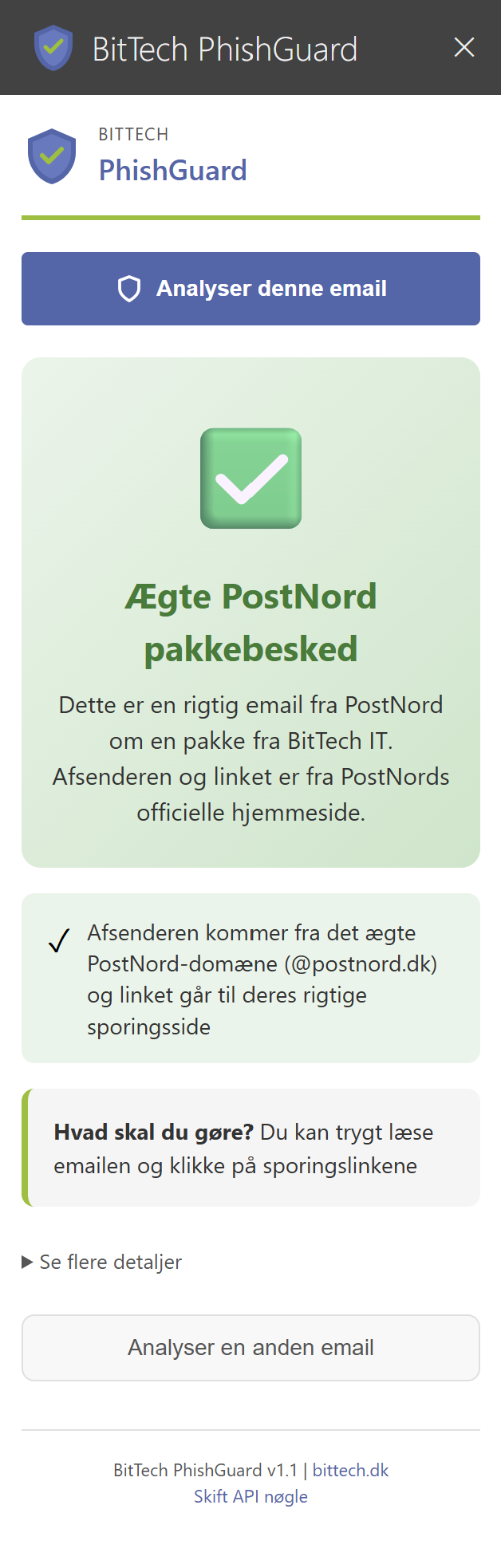 PhishGuard viser en risikoscore, forklarer hvorfor emailen er mistænkelig, og giver en konkret anbefaling - alt sammen på dansk.
